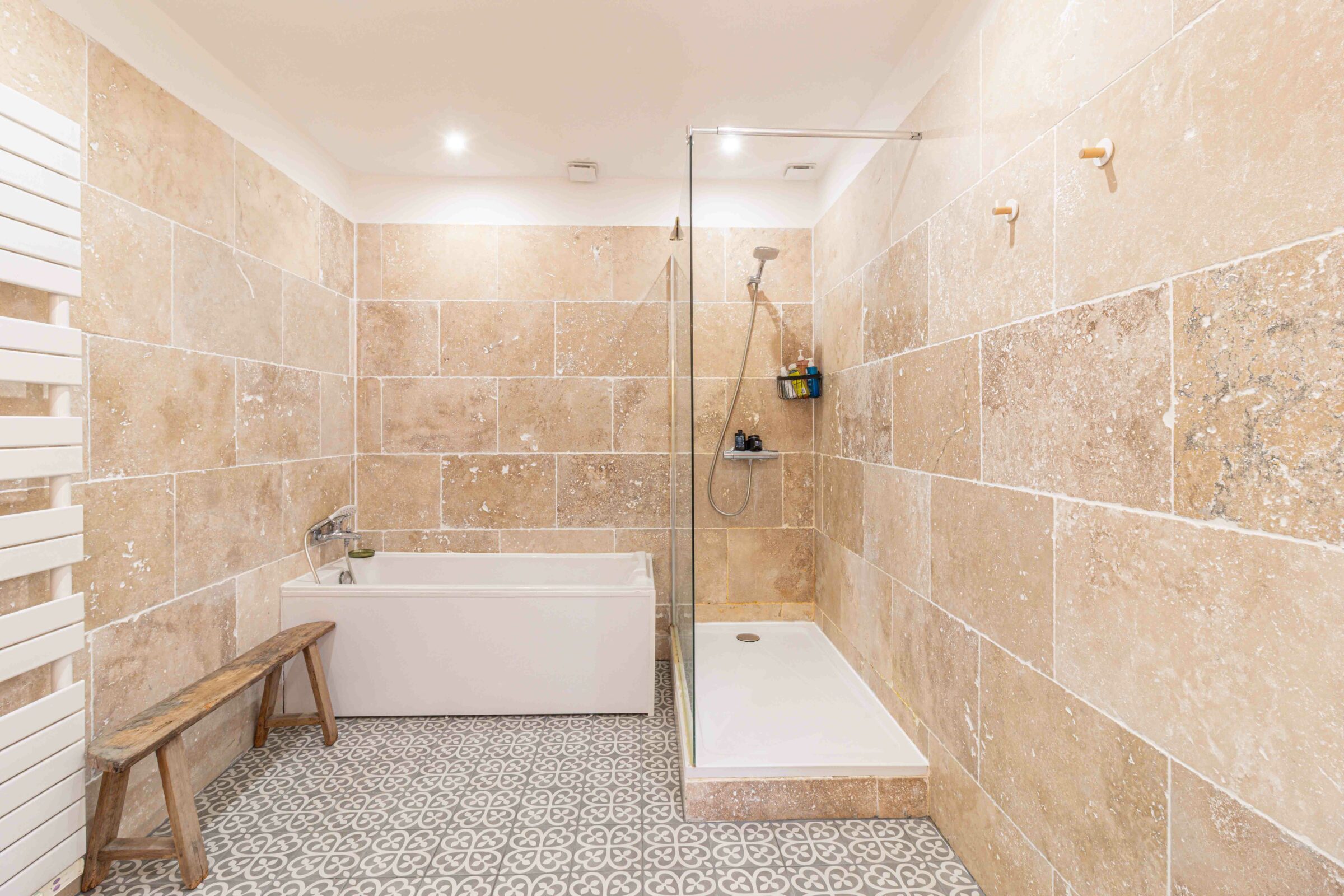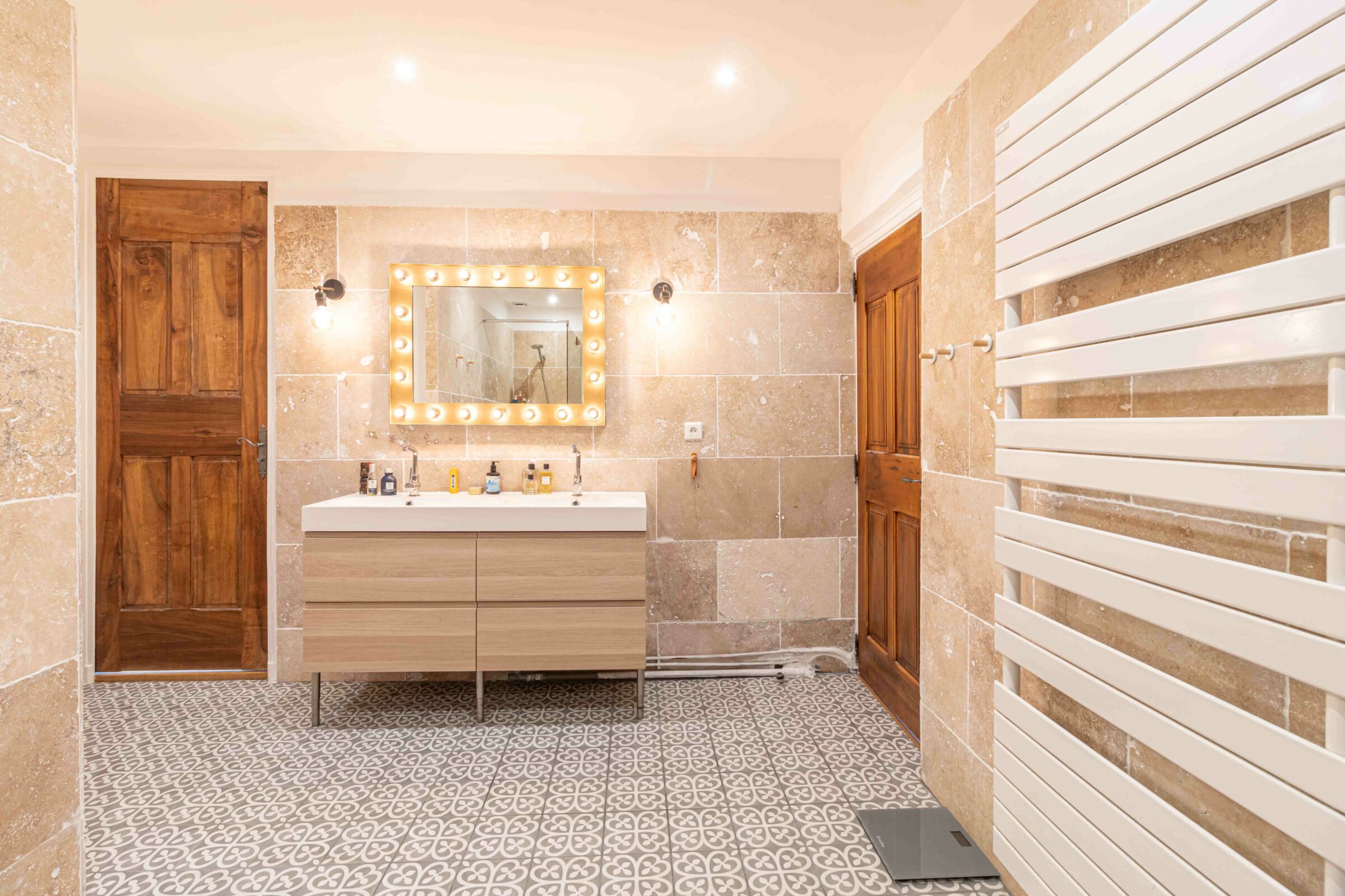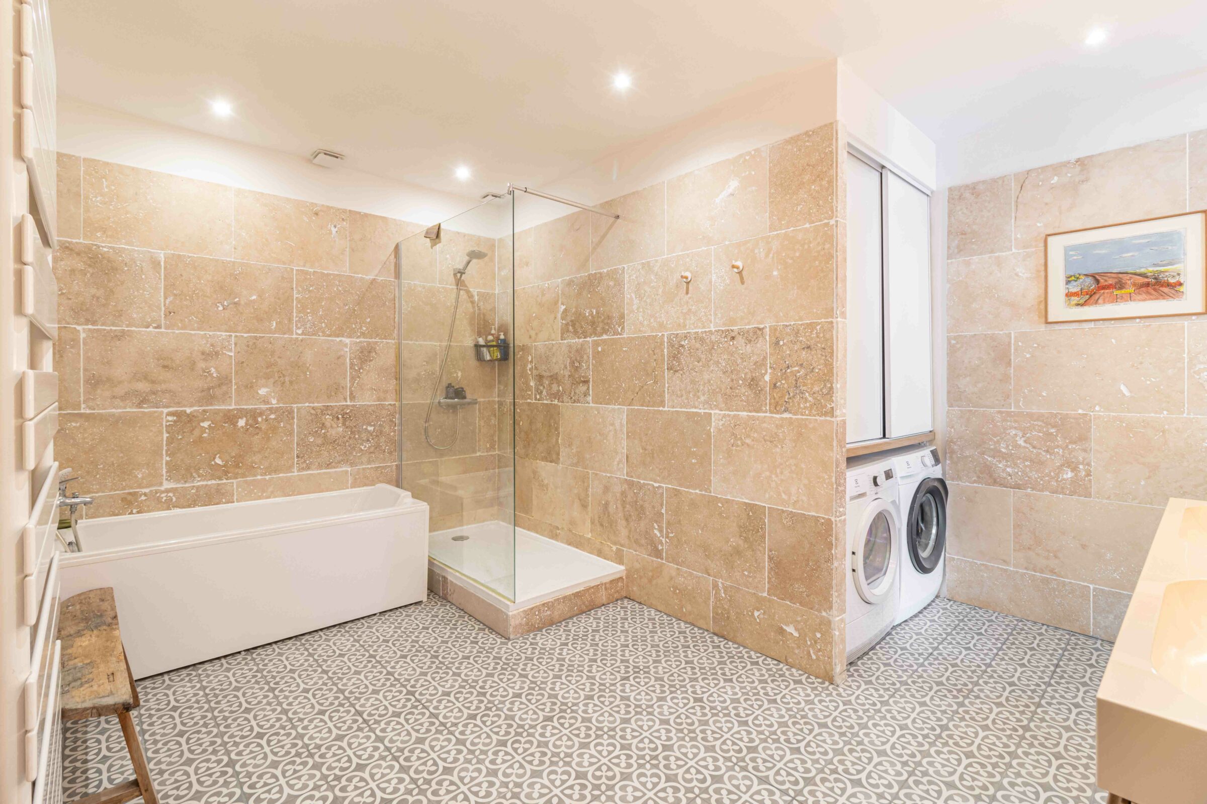 Dès l’entrée, un vaste hall donne le ton : lumineux et accueillant, il distribue harmonieusement les différentes pièces tout en mettant en valeur les parquets en chevrons, les hauts plafonds et les cheminées d’époque qui confèrent à l’ensemble une atmosphère à la fois chic et chaleureuse.