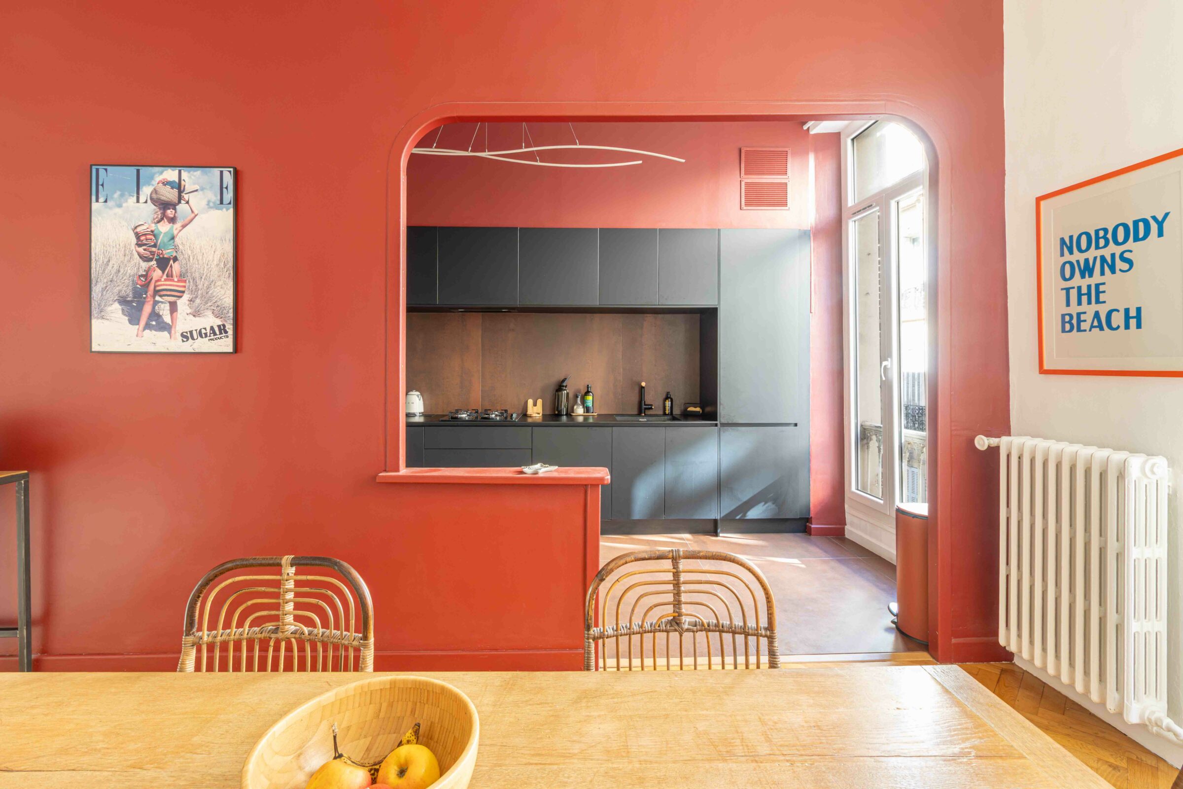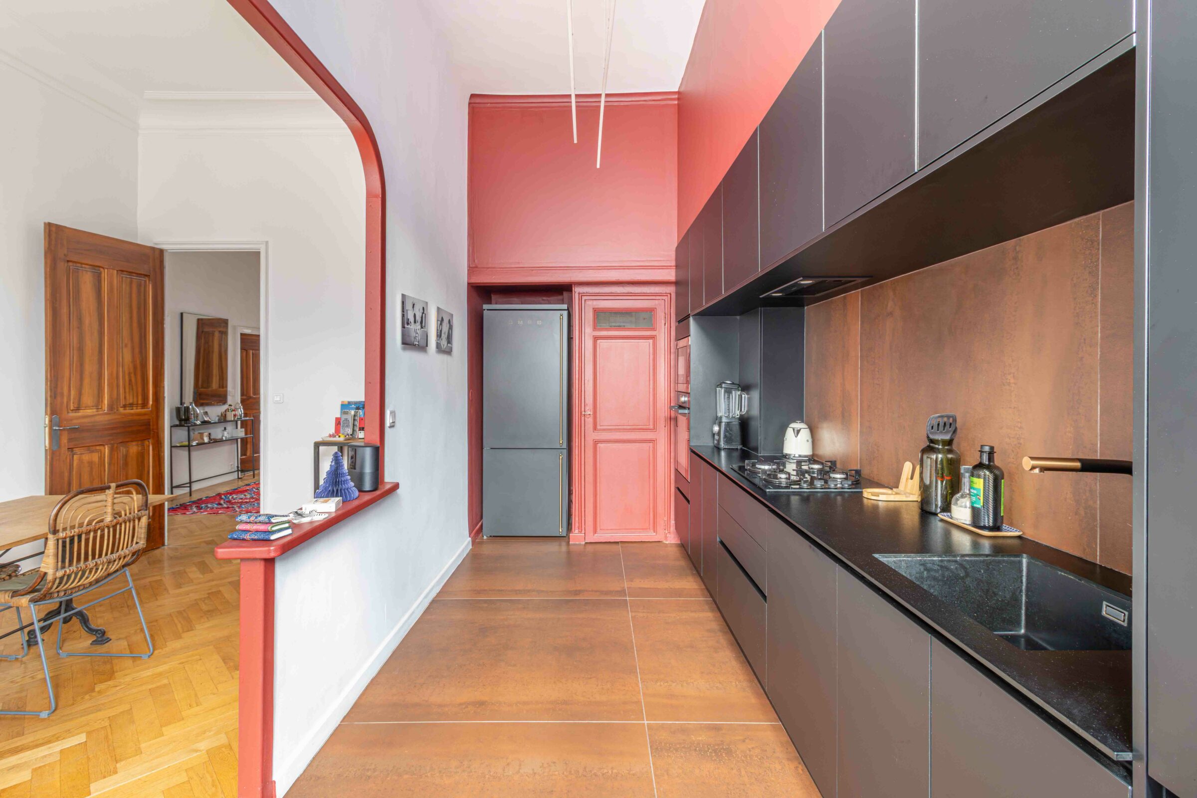 L’espace de vie principal de 47 m² se compose d’une cuisine ouverte, d’une salle à manger et d’un salon confortable, subtilement séparés par une superbe verrière atelier qui apporte du caractère et laisse passer la lumière naturelle. Côté nuit, l’appartement propose deux grandes chambres, dont l’une offre la possibilité de créer deux chambres d’enfants, selon les besoins de la famille.