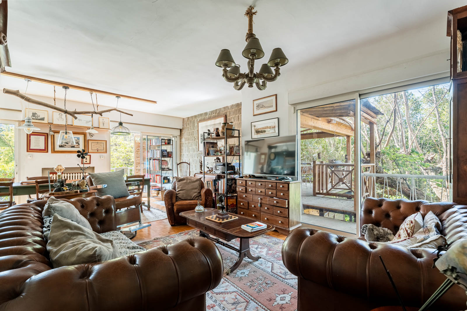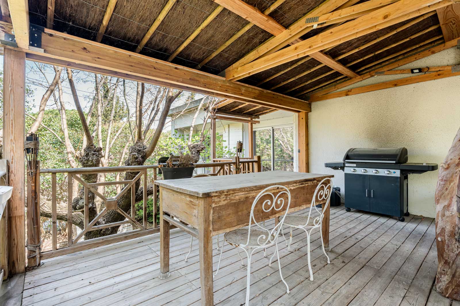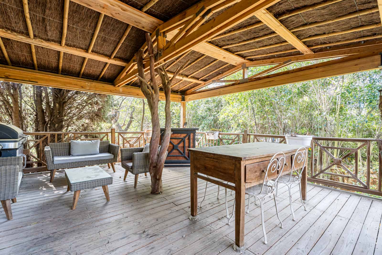 À l’étage, la maison s’organise autour d’un grand séjour lumineux avec cuisine ouverte, prolongé par une superbe terrasse suspendue dans les arbres et un balcon, parfait pour profiter de repas en extérieur dans un cadre verdoyant. Une seconde suite parentale de plus de 29 m² vient compléter ce niveau, offrant un espace de vie confortable et intimiste.