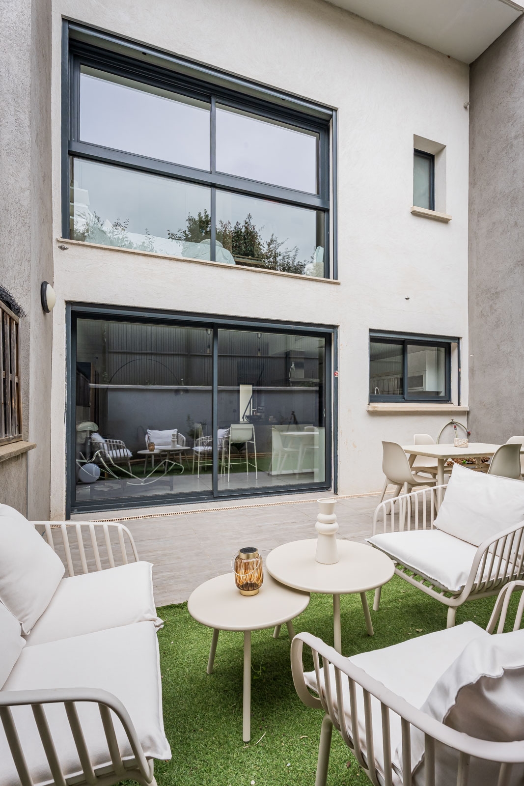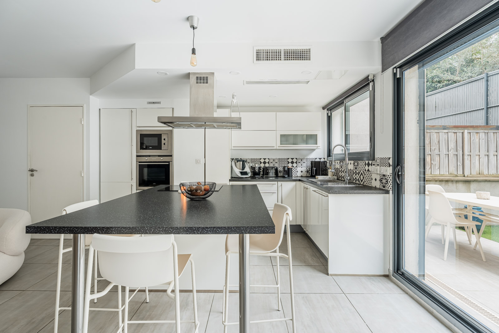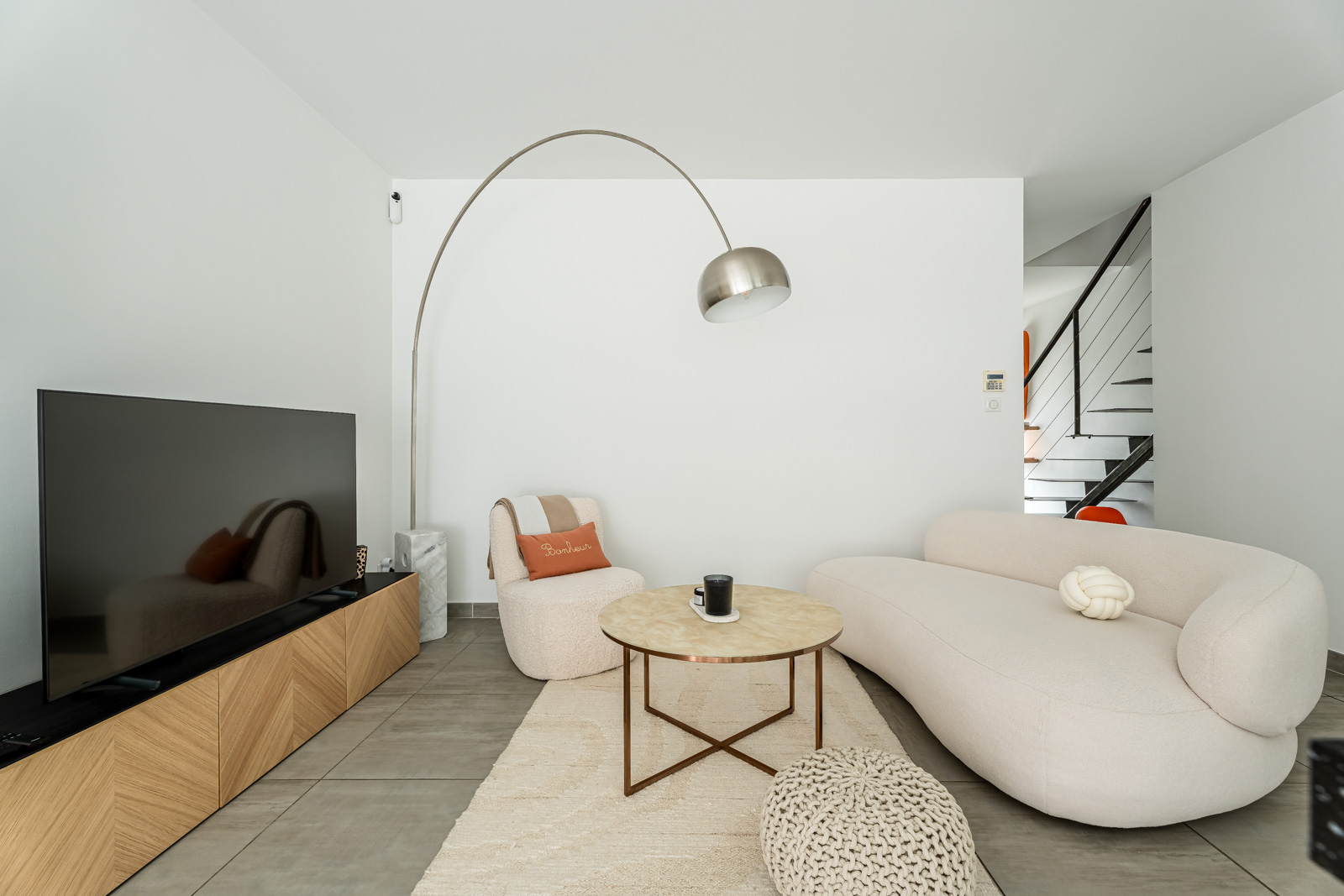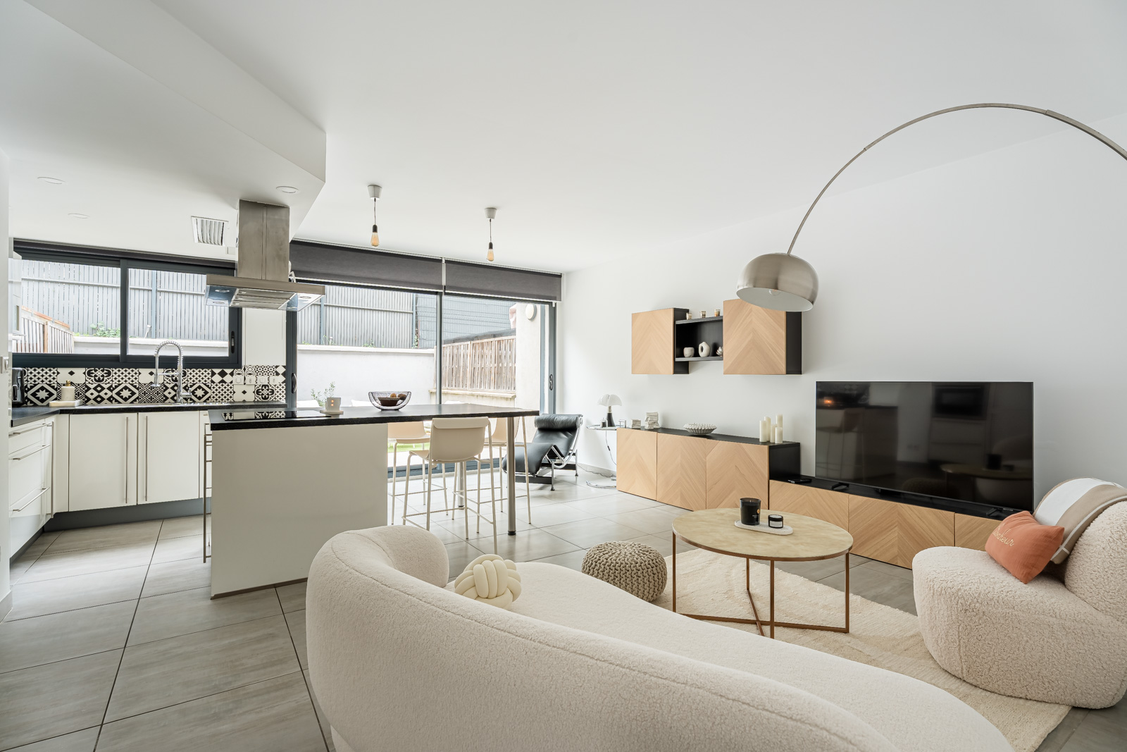 La pièce de vie, lumineuse et chaleureuse, s’organise autour d’un séjour avec cuisine ouverte, créant un espace convivial et fonctionnel au quotidien. Cet espace s’ouvre directement sur le jardin, véritable prolongement de la maison, parfait pour les repas en extérieur, les moments de détente ou les jeux des enfants.
