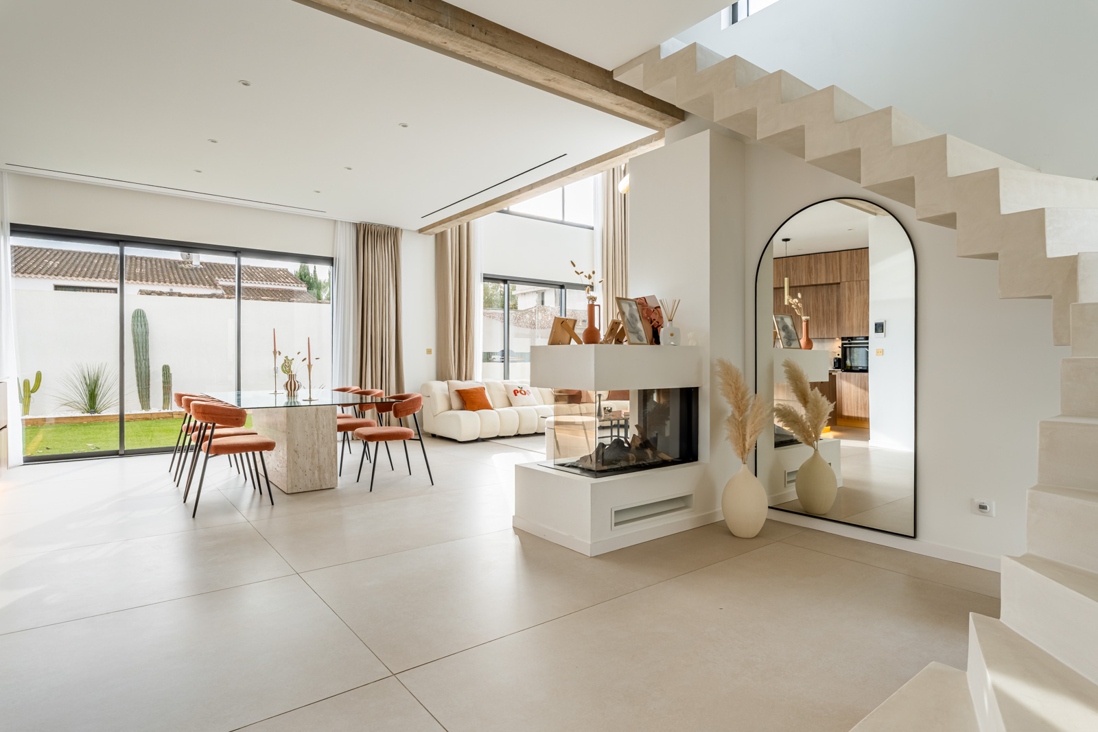 Le séjour cathédrale, culminant à six mètres sous plafond, offre un espace rare, presque théâtral, où la cheminée devient le foyer autour duquel se rassemblent les instants précieux. La cuisine, aux finitions haut de gamme et au plan de travail en marbre, prolonge cette sensation d’élégance discrète, pensée autant pour le quotidien que pour le plaisir de recevoir.