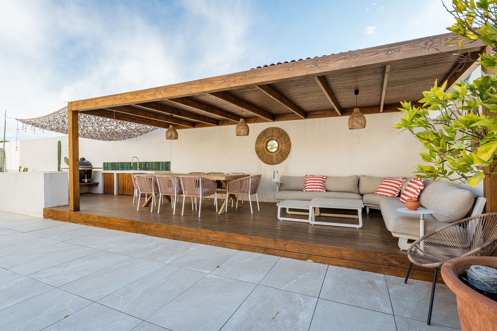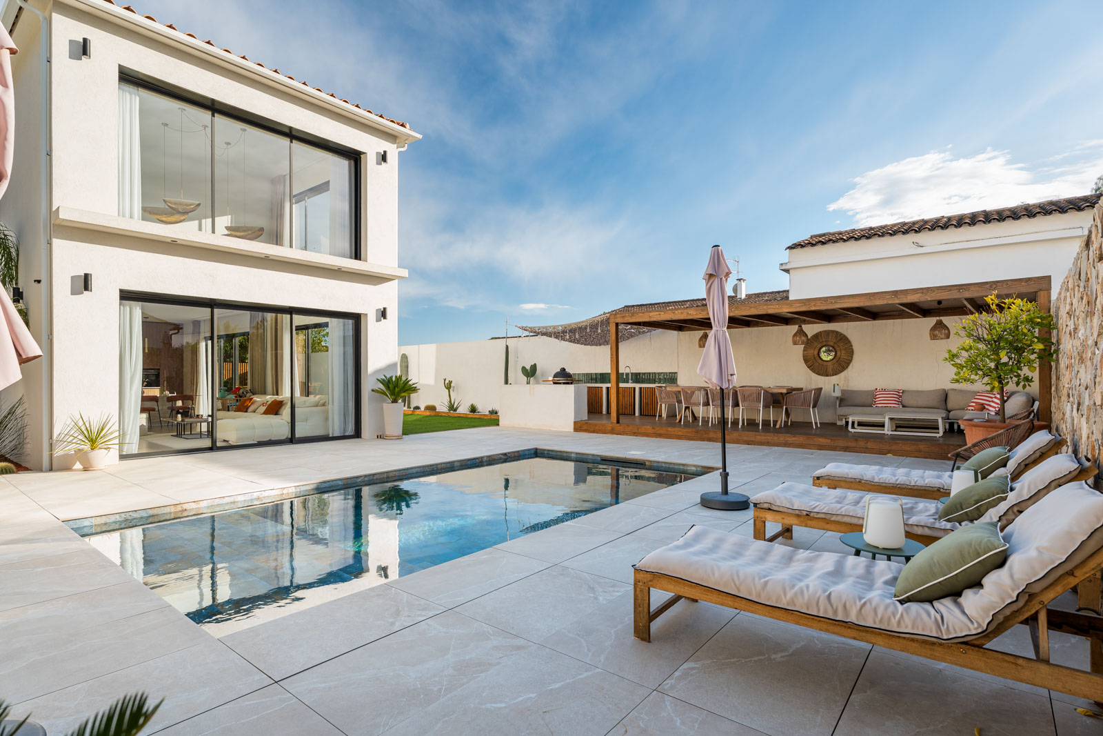 Les extérieurs révèlent piscine, cuisine d’été, terrain de pétanque et espaces de détente.